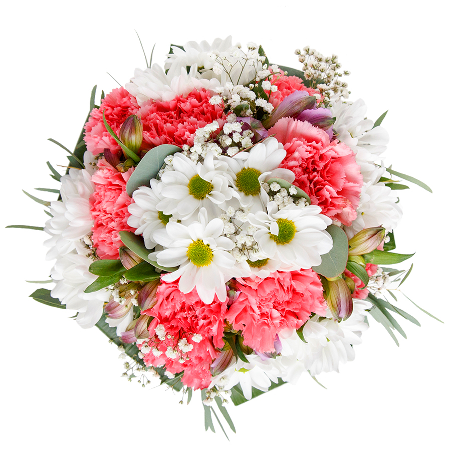 Admire the splendid and unique beauty of our seasonal bouquet. Featuring a delicate mix of snow-white chrysanthemums, fluffy gypsophila, and light pink carnations, beautifully combined with vibrant aspidistra leaves. Each flower is hand-selected to guarantee exceptional freshness and allure.